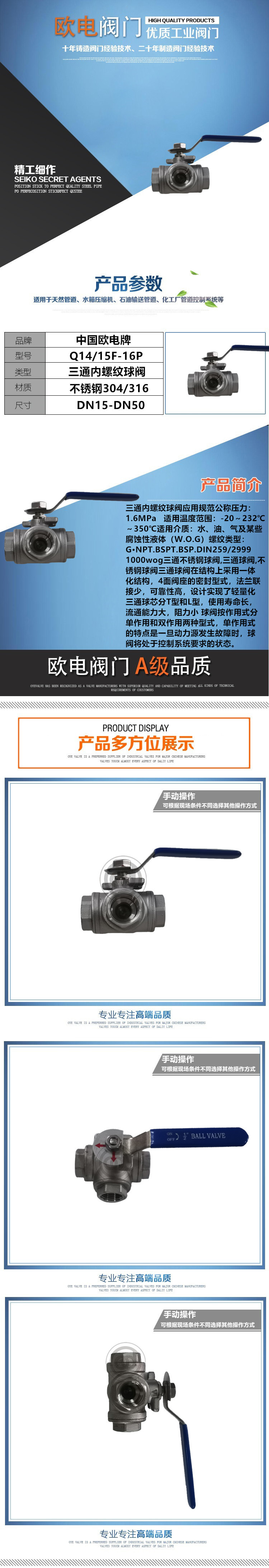 三通内螺纹球阀适用温度范围:-20℃〜350℃。不锈钢片式球阀适用于水,油,气和某些腐蚀性液体(W.O.G)。现在不锈钢片式球阀普遍用以化工,原油,电力,制药,啤酒,食品,乳制品和饮品,化妆品和工程配套行业的管道等领域。
