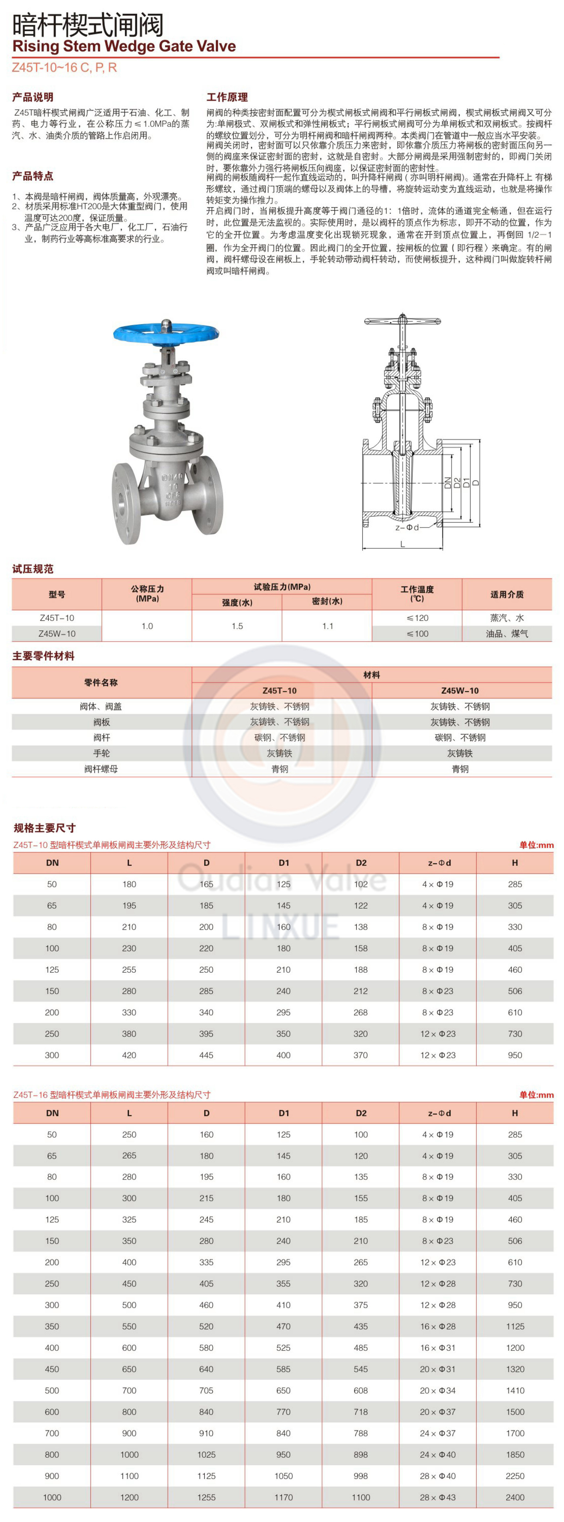 适用于原油,化工,水力,火力发电站各系统管道的公称压力PN1.6〜16.0mpa,工作温度≤-29℃〜550℃,切断或联接管道介质。适暗杆闸阀介质用以:水,油,蒸气,酸,碱,氨,尿素,含硫天然气等。