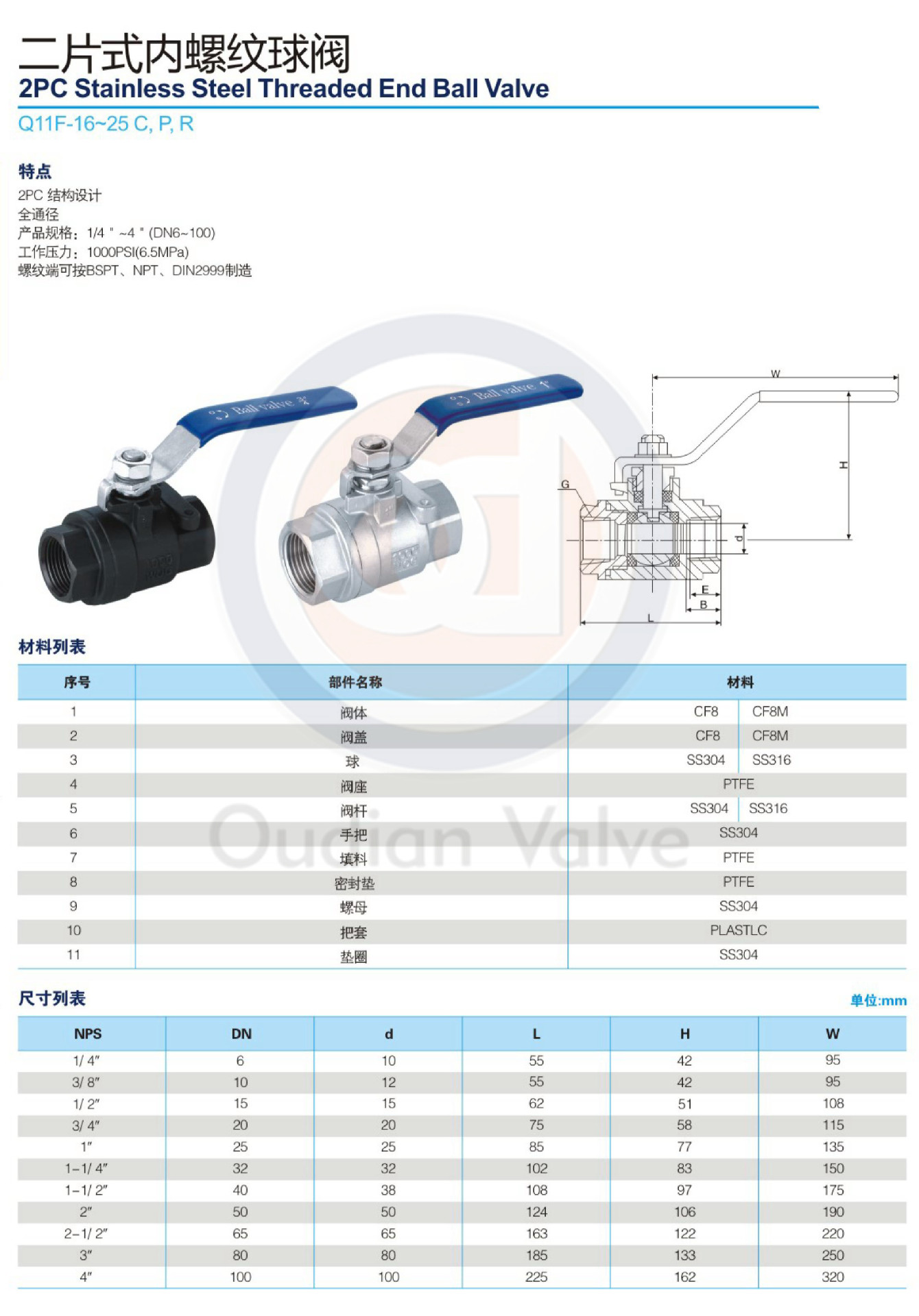 两件式不锈钢螺纹球阀Q11F法则机能: