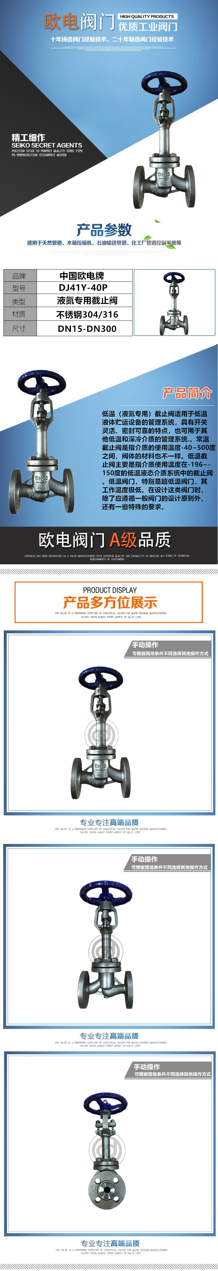 DJ41Y,DJ41W 型 PN16〜PN40低温截止阀适用于低温液体储运装置的管理系统。具有开关灵巧,密封确实的特色。它也可以用于其他低温和低温介质的管理系统。