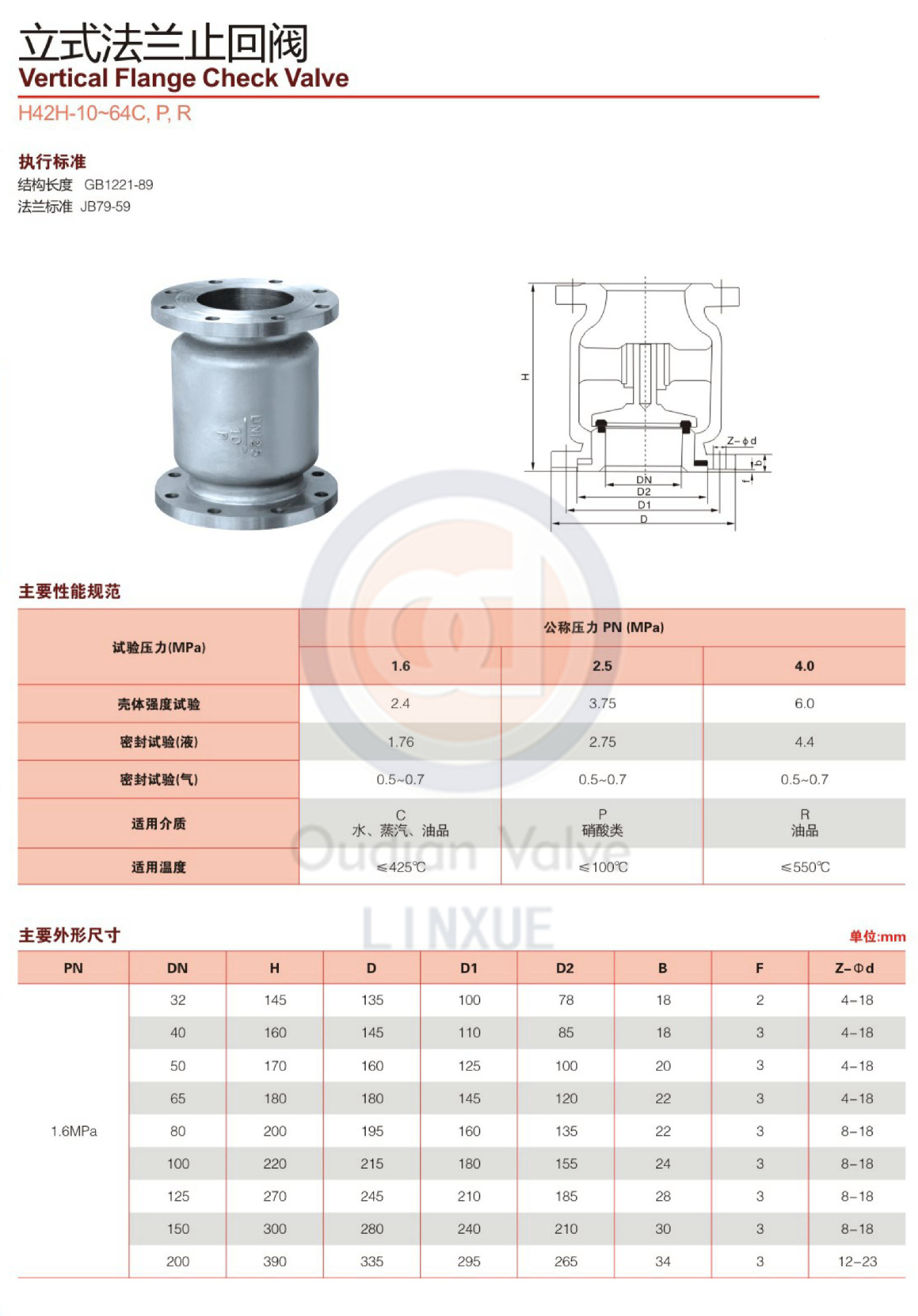 立式止回阀:由于管道入口处的介质压力,可以通过克服弹簧阻力来敞开或关闭阀门,当入口端的介质压力小于出口端的介质压力时,弹簧将阀芯推至阀座以关闭阀,防止介质倒流,因此起到了止回阀的功用。立式止回阀普遍用以化工,液化石油气,流体等行业。止回阀可以分成三种类别:提升止回阀旋启式止回阀和蝶式止回阀。