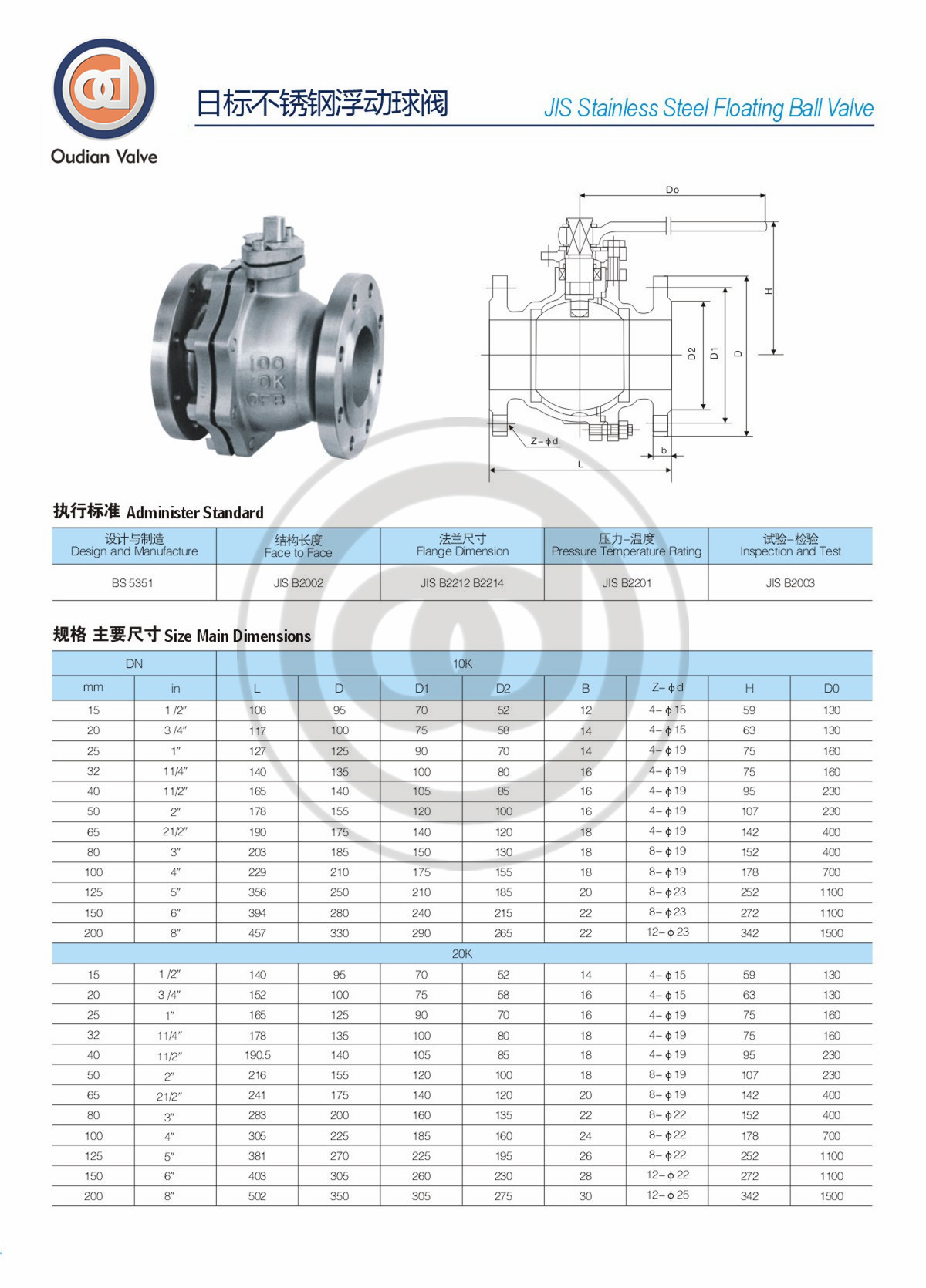 日标球阀,日标法兰球阀:浮动球球阀有着先进的结构,简便的操作和较长的使用寿命。日本标准球阀一般而言分成法兰型和螺纹连接型。两者之间的差别在于它们已连接到管道。,但是阀门的总体设计结构和配置与启闭件相同。球体环绕阀体的中心轴转动90°,以控制管道的打开和关闭。
