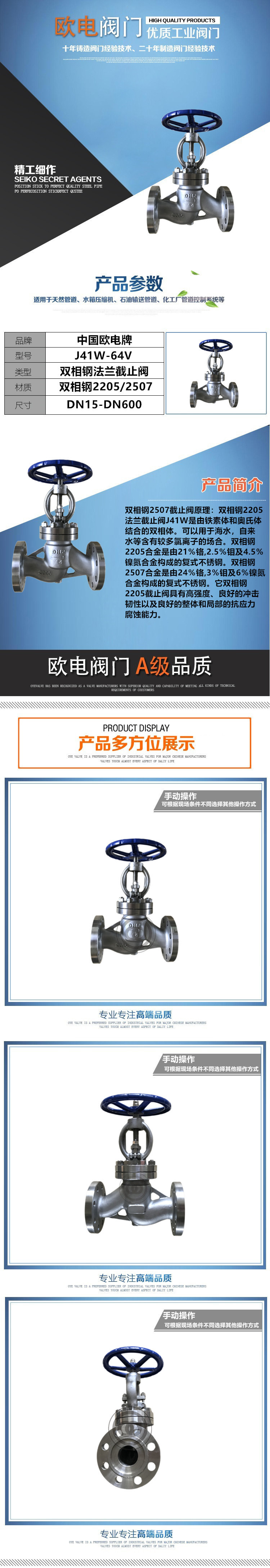 我公司专业从事海水生产special2205双相钢闸阀不锈钢球阀2507双相不锈钢球阀2205双相不锈钢截止阀2507双相不锈钢截止阀2205双相2507双相不锈钢闸阀2205双相不锈钢y型过滤器2507双相不锈钢过滤器2205止回阀 2507止回阀和其他产品双相钢高压截止阀J41W法则:双相钢截止阀J41W是铁氧体和奥氏体双相体的组合。可用于海水,自来水和双相钢2205合金是由21%铬,2.5%钼和4.5%镍氮合金构成的双相不锈钢。它的双相钢2205截止阀具有高强度,良好的冲击坚韧和良好的性能。总体和局部抗应力的腐蚀能力。