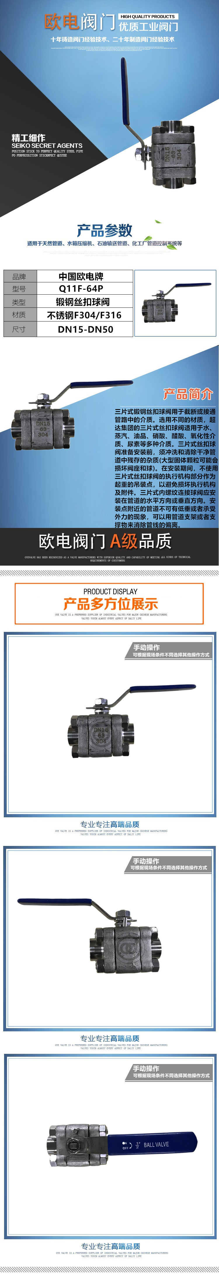 锻钢丝扣球阀用以切断或连接管道中的介质。选取不同的材质,醋酸适用于水,蒸气,油,硝酸,锻钢丝扣球阀,氧化介质,尿素和其他介质。锻钢丝扣球阀在打算安装之前,显影并拔除管道中残余的杂质(大的固体微粒可能会损坏阀座和球)。在安装过程中,锻钢钢丝球阀的执行器部分不当做提升点以避免损坏锻造钢制内螺纹连接球阀应在管道的水准或垂直方向上安装,安装点附近的管道不应下垂或背负外力。可以用到管道支架或支撑来扫除管道错误。
